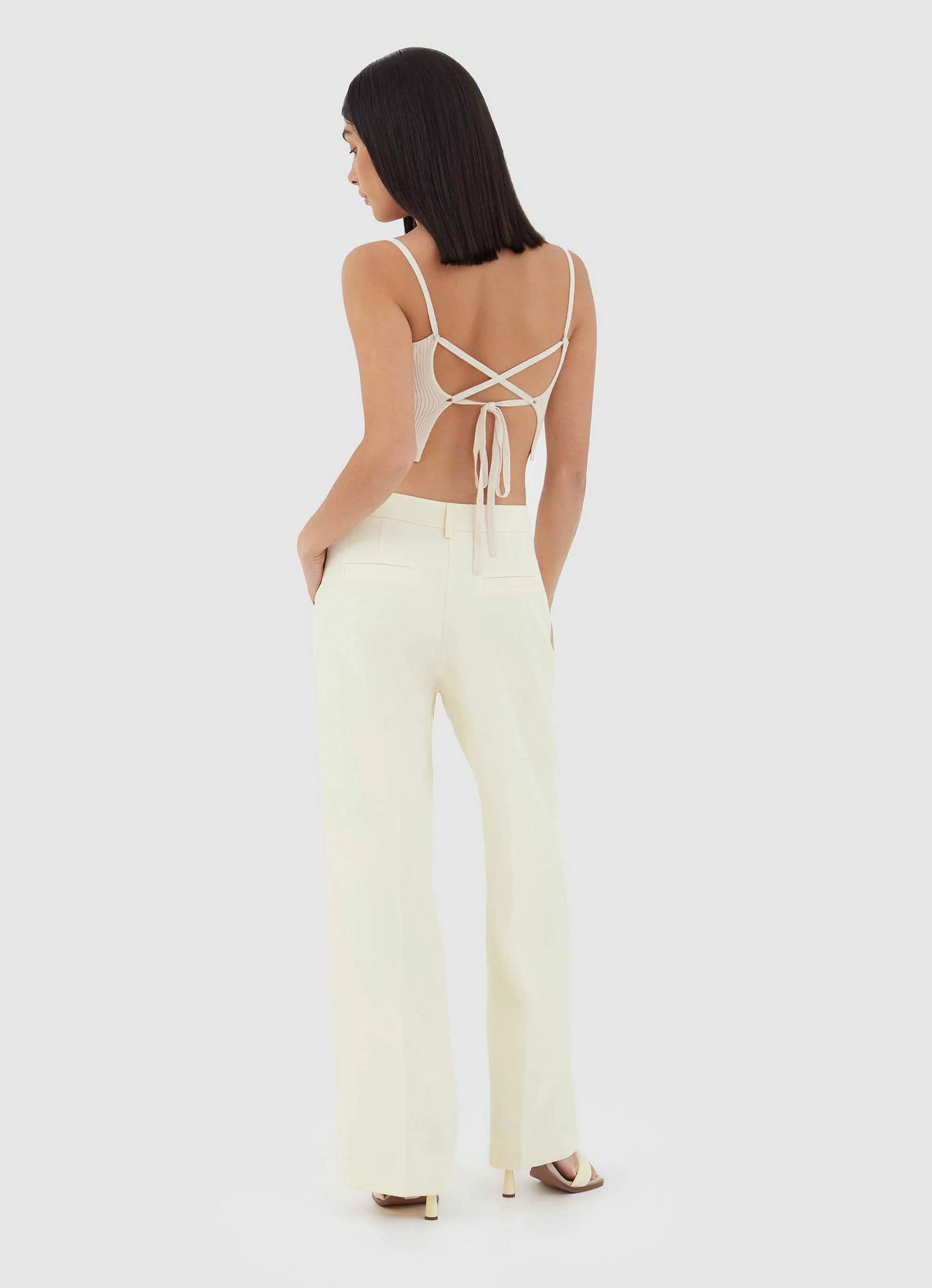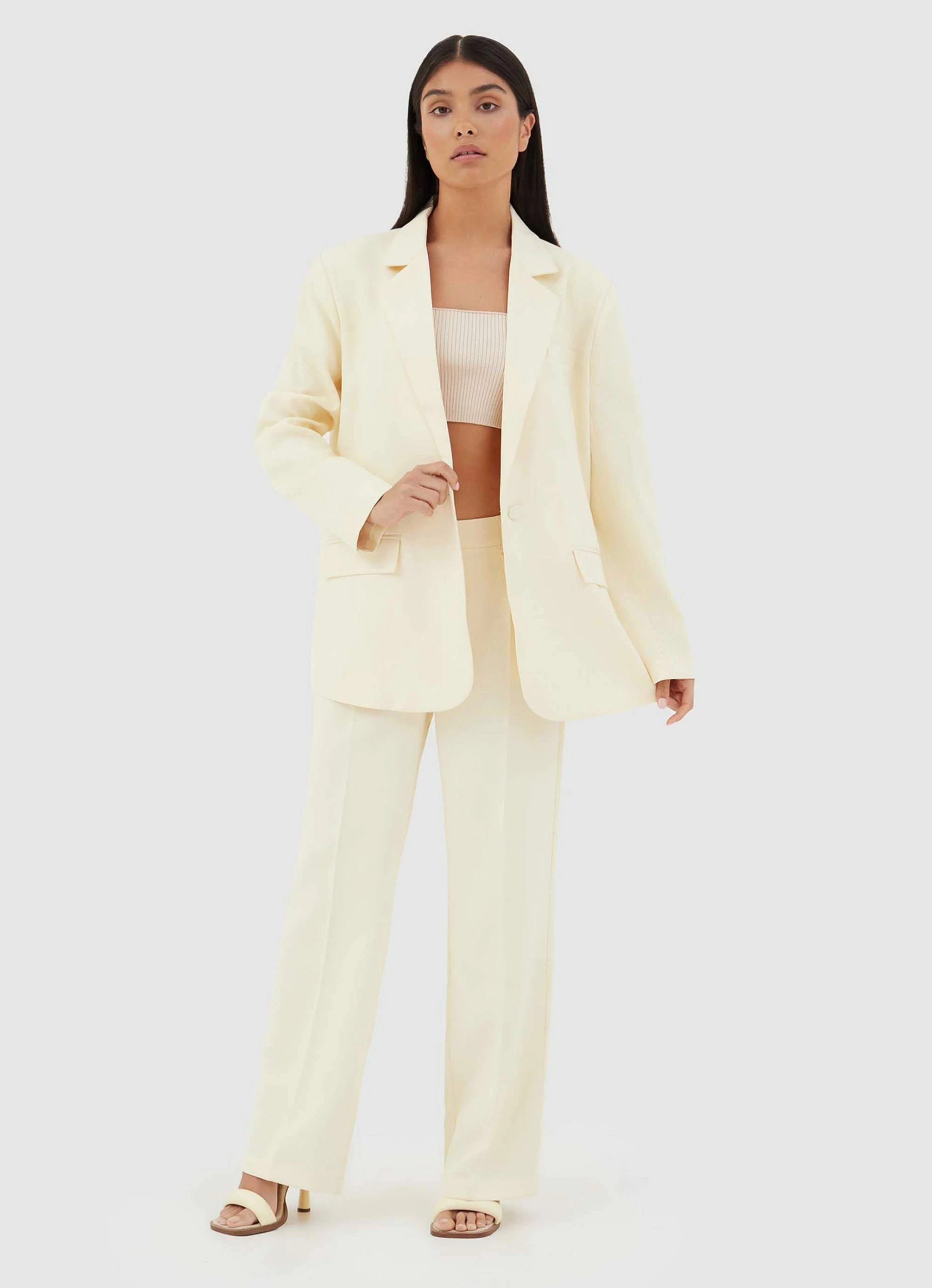 Step into springtime with the Cervo trouser. A classic wide leg silhouette in a slouchy light yellow fabric, the waist sits just above the hip. Designed with work in mind style with the matching blazer for a sharp look. Adding trainers for every day,