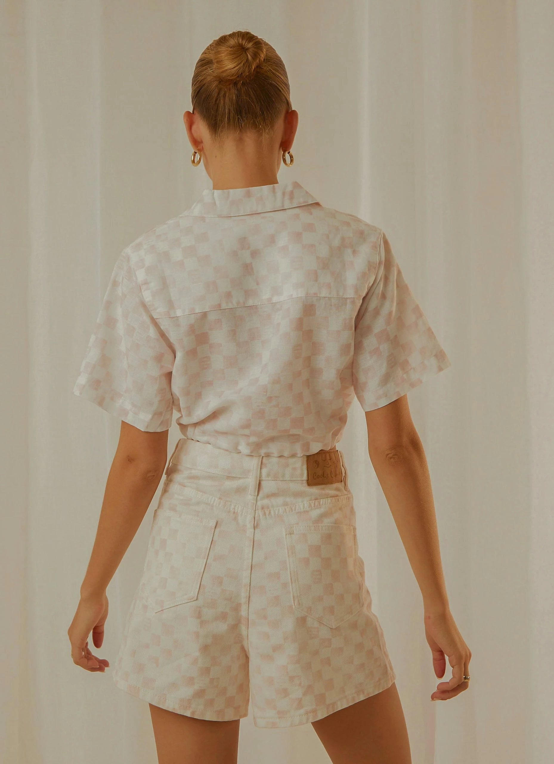 The Safari Tie Top in Pink Checker is designed to highlight the smallest part of your frame with drawstring ties. The silhouette perfectly complements a high-rise skirt or pants.