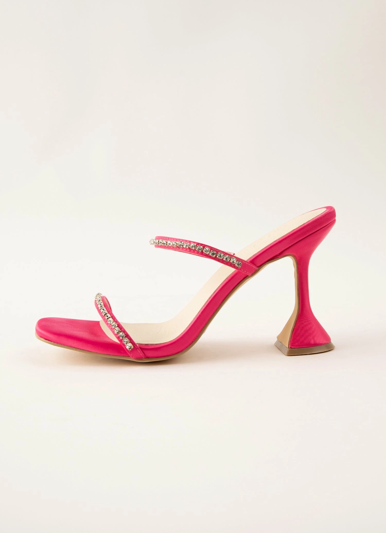 Handpicked for the Peppermayo party girl! Crafted in black satin look finish with diamanté double strap across the foot and finished with an hourglass heel.