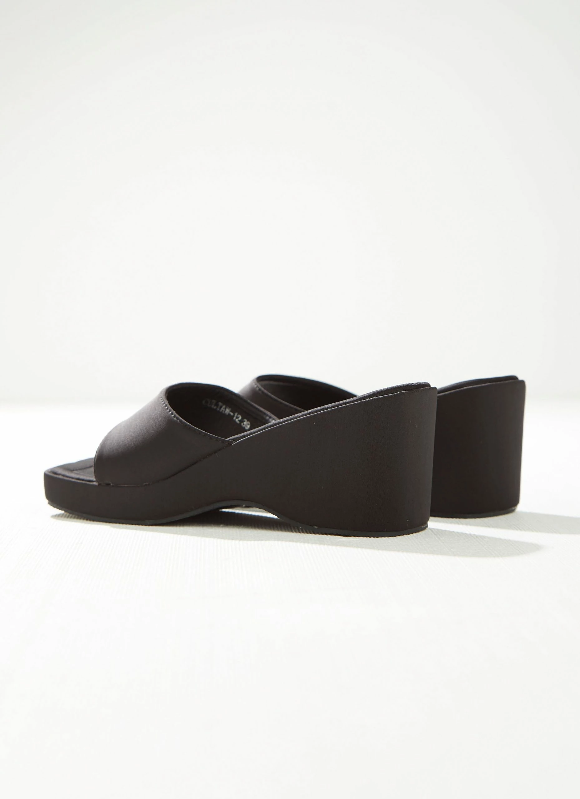 These 90s inspired mules are perfect for adding height to your fave ‘fits. Featuring a black PU strap with a square toe and a platform design, they’re a must-have.