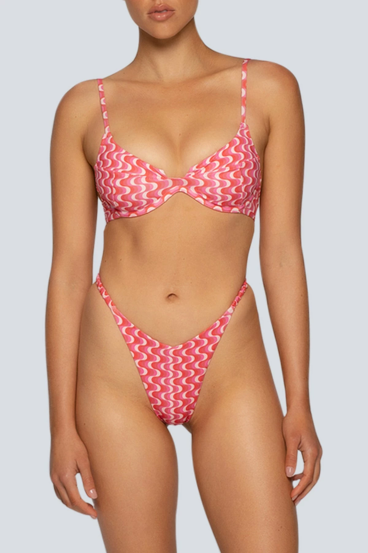The Felix structured bra cup bikini top gives new meaning to shape and form. Effortlessly supporting and moving along bust and hips to create curved lines of beauty and definition. Featuring a panelled bra cup and string tie back for flexibility in fit for different body shapes. Paired with a signature high cut bottom with ruched detailed on the side.