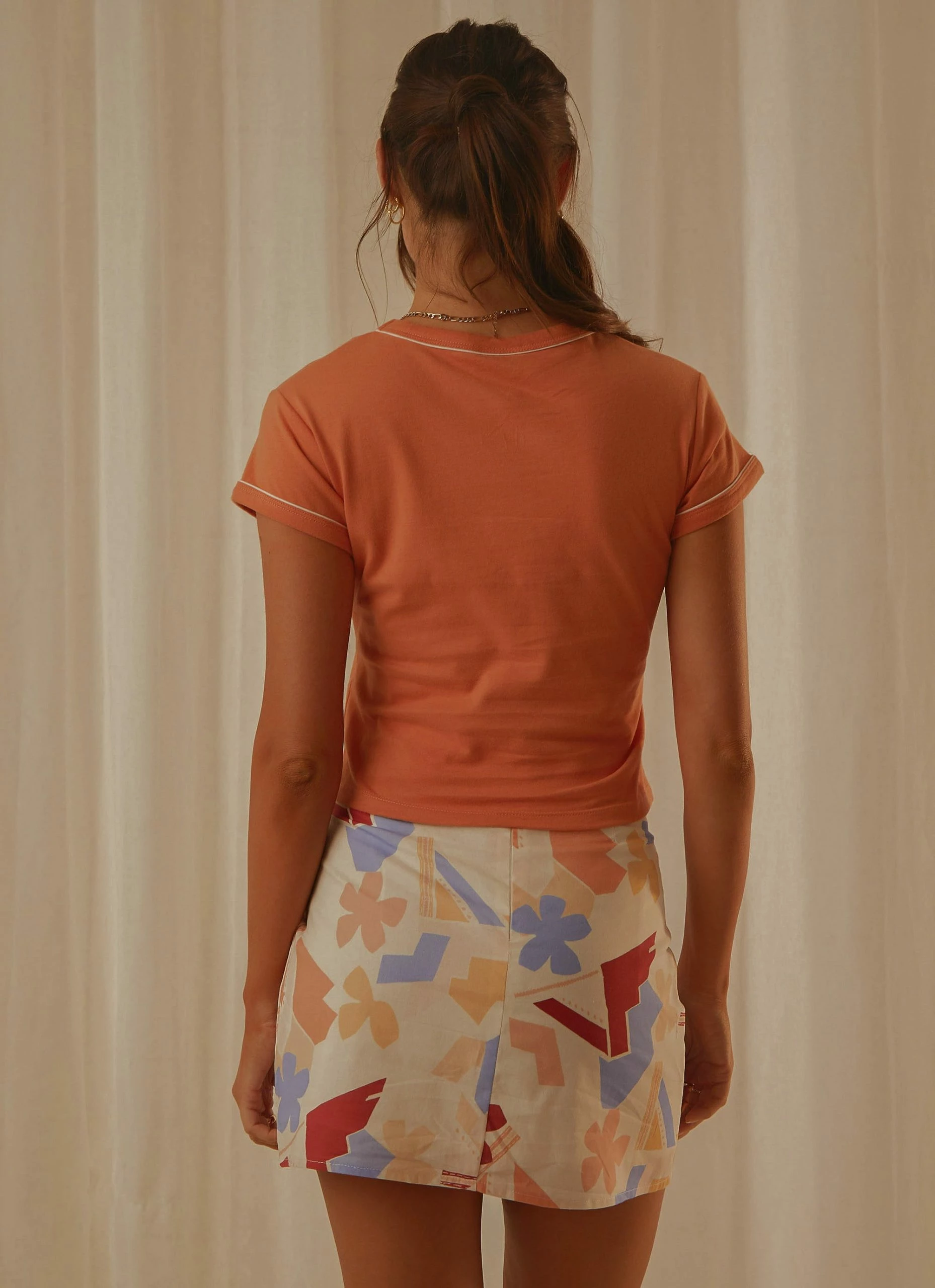 Your everyday wardrobe needs this! The Piped Baby Tee is a fitted 90’s baby tee featuring a cropped waist length with short capped sleeves and finished with contrast piping detail around neck and sleeves.