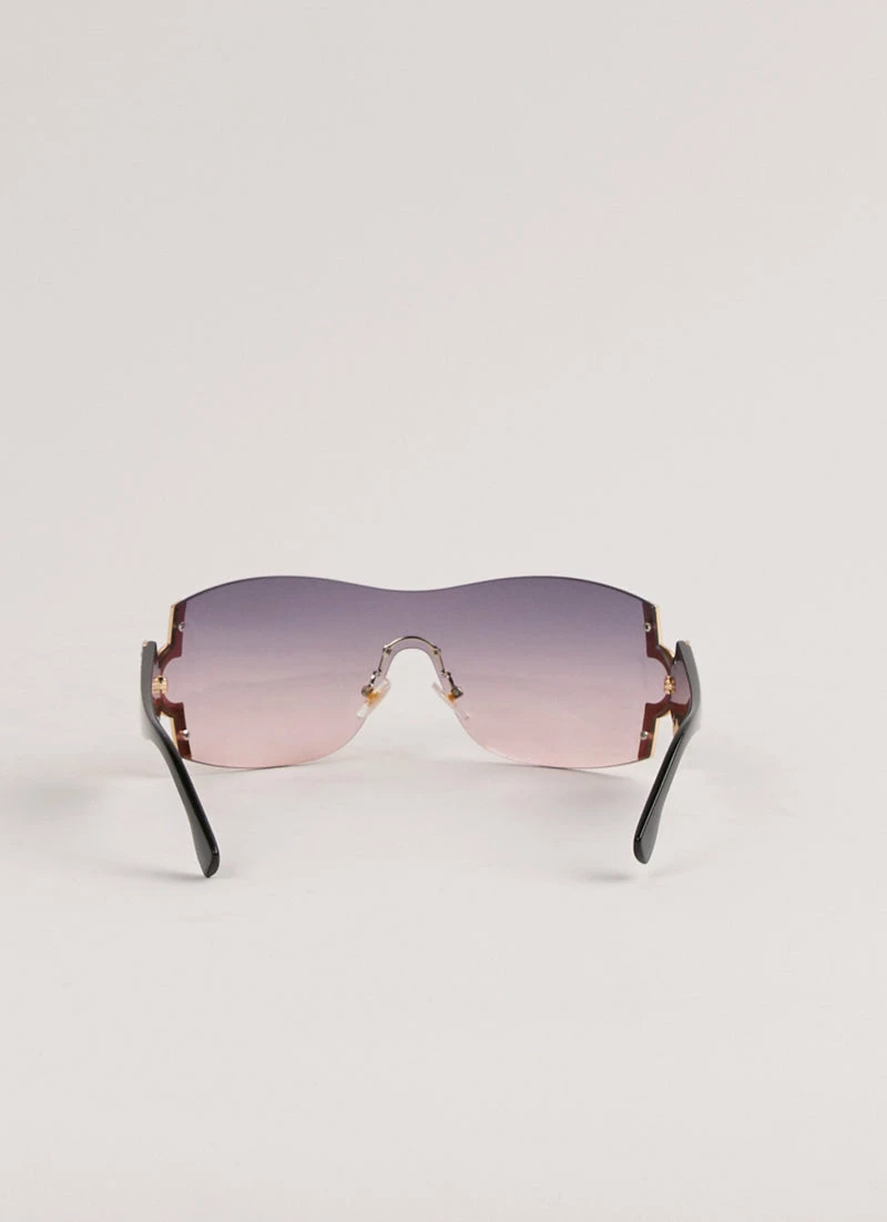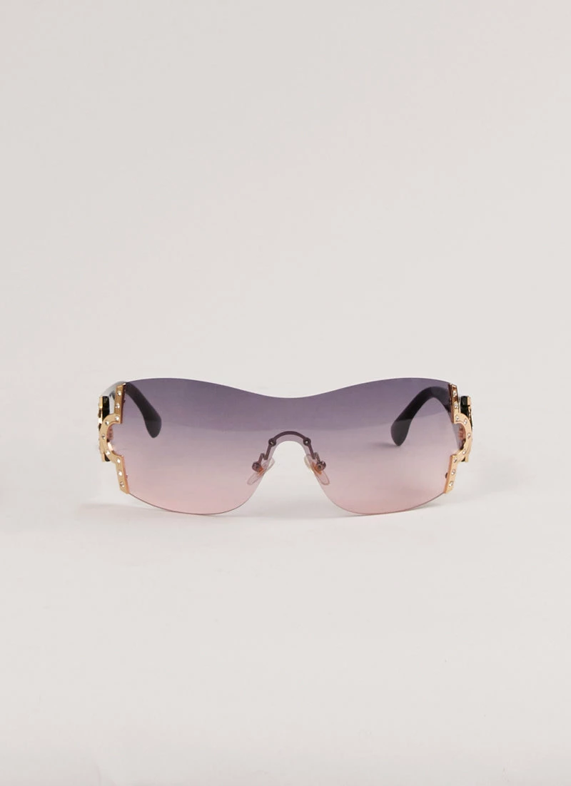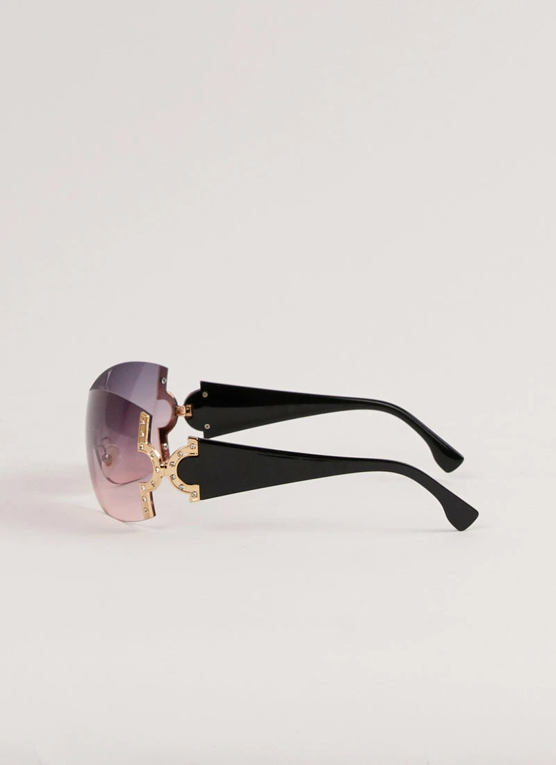 Sleek and chic in the Glacier Sunglasses. A large square-rounded sunglasses style with violet toned lenses and thick black armbands with gold hardware and diamanté detailing.