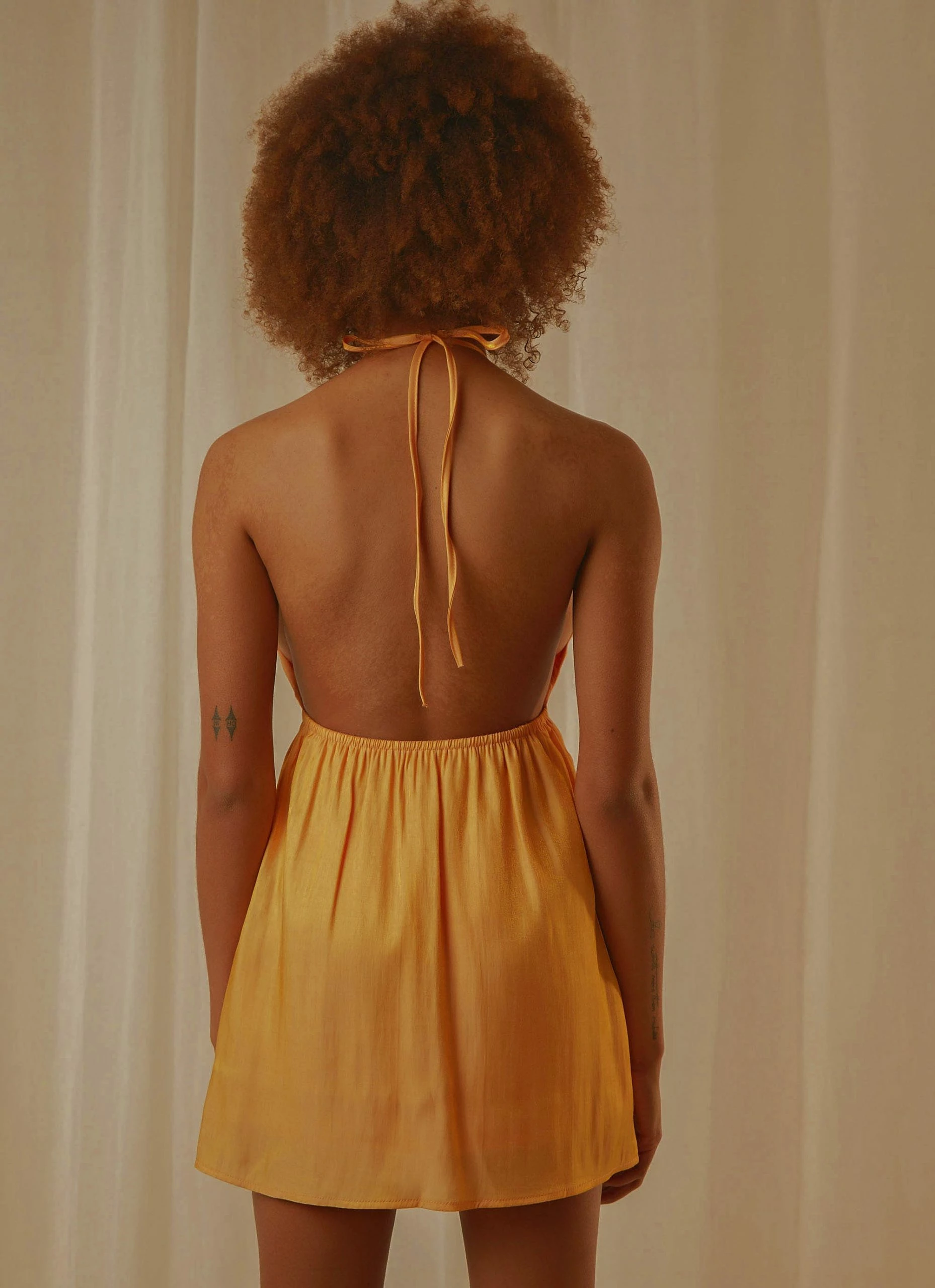 Worth making plans for! The Love Lessons Mini Dress is ready for a night on the town featuring a high neck halter neck, open back and made in a mango eye catching shimmer fabric. Complete the look with a simple heel and your favourite earrings.