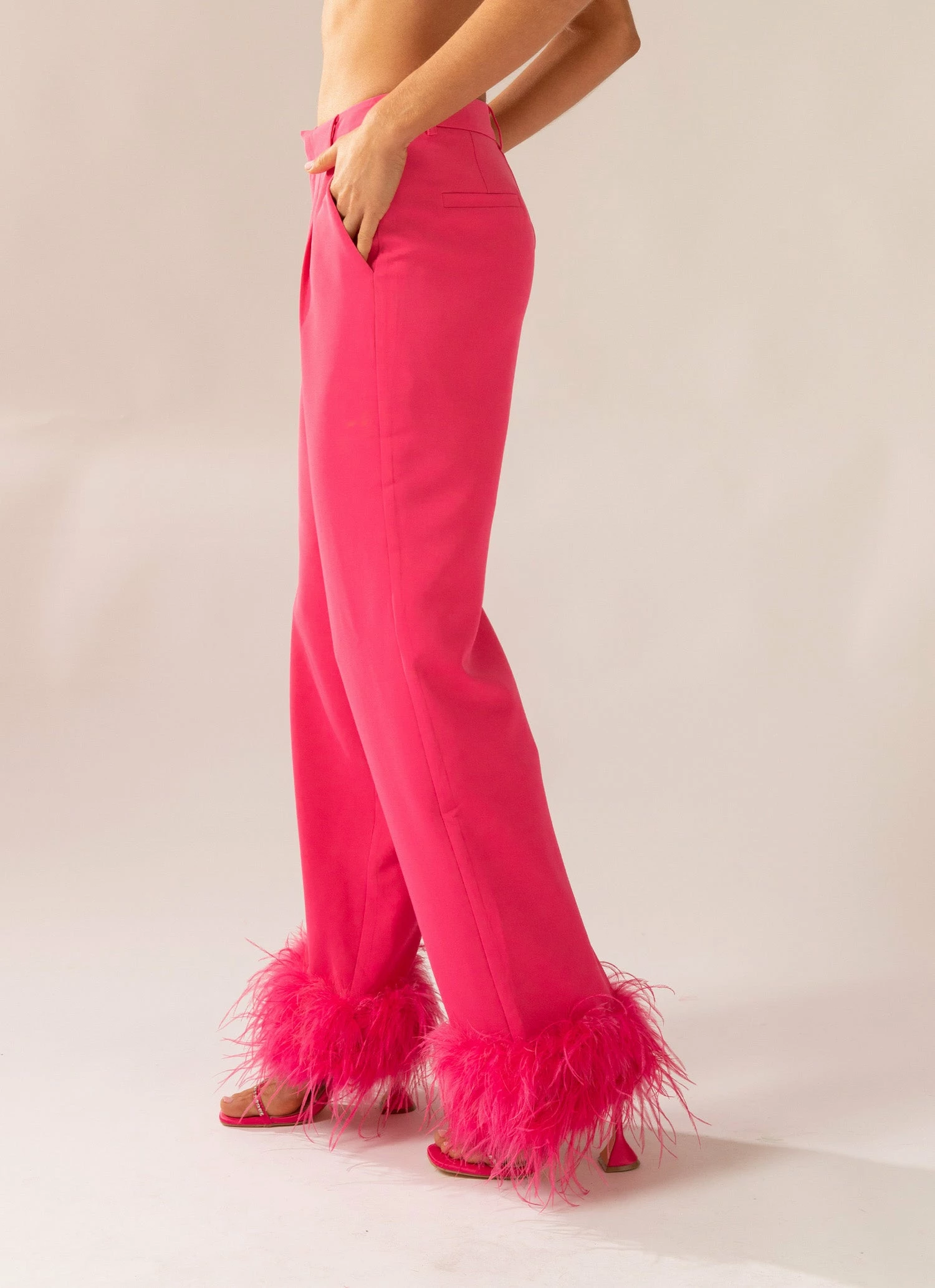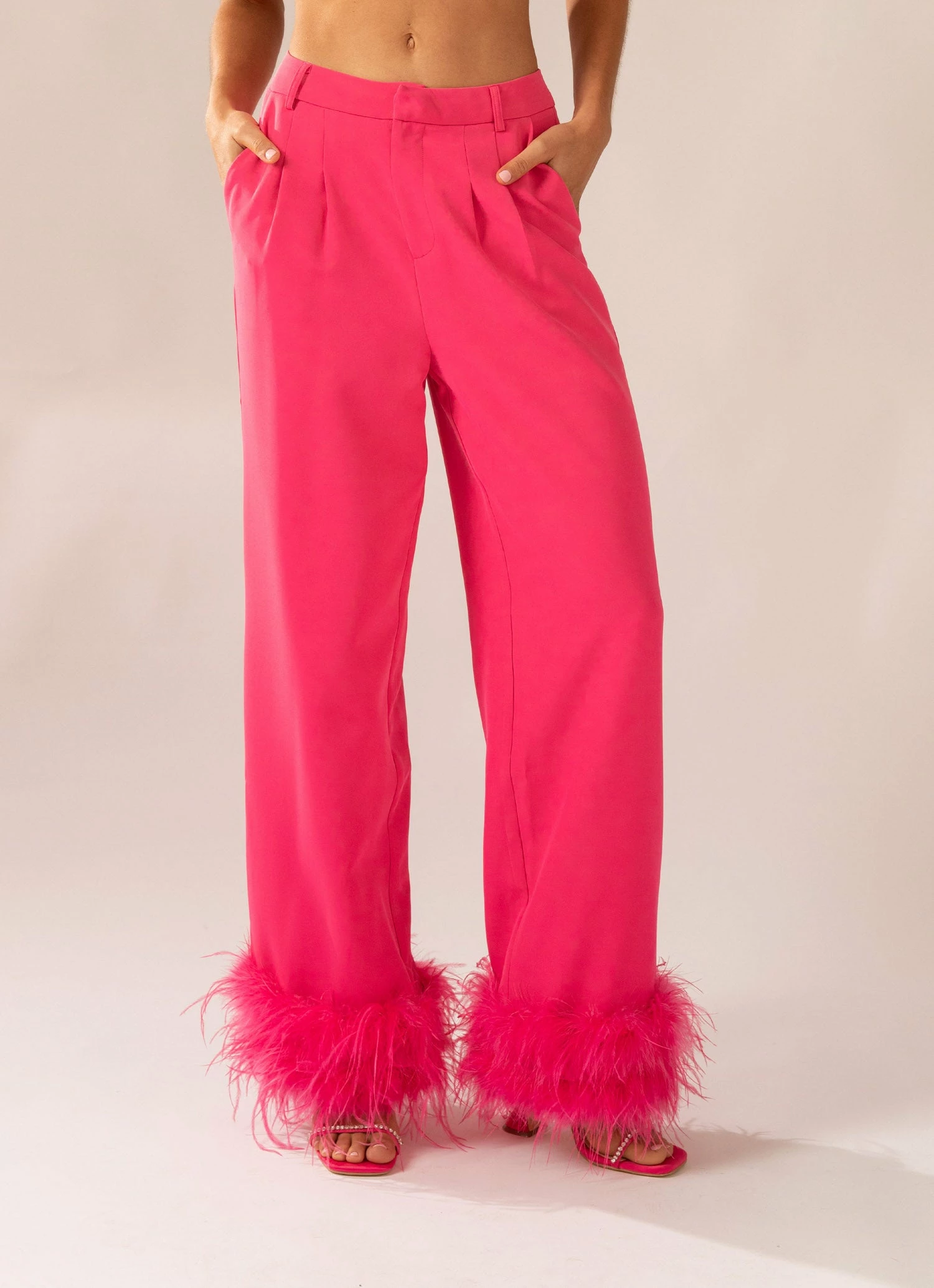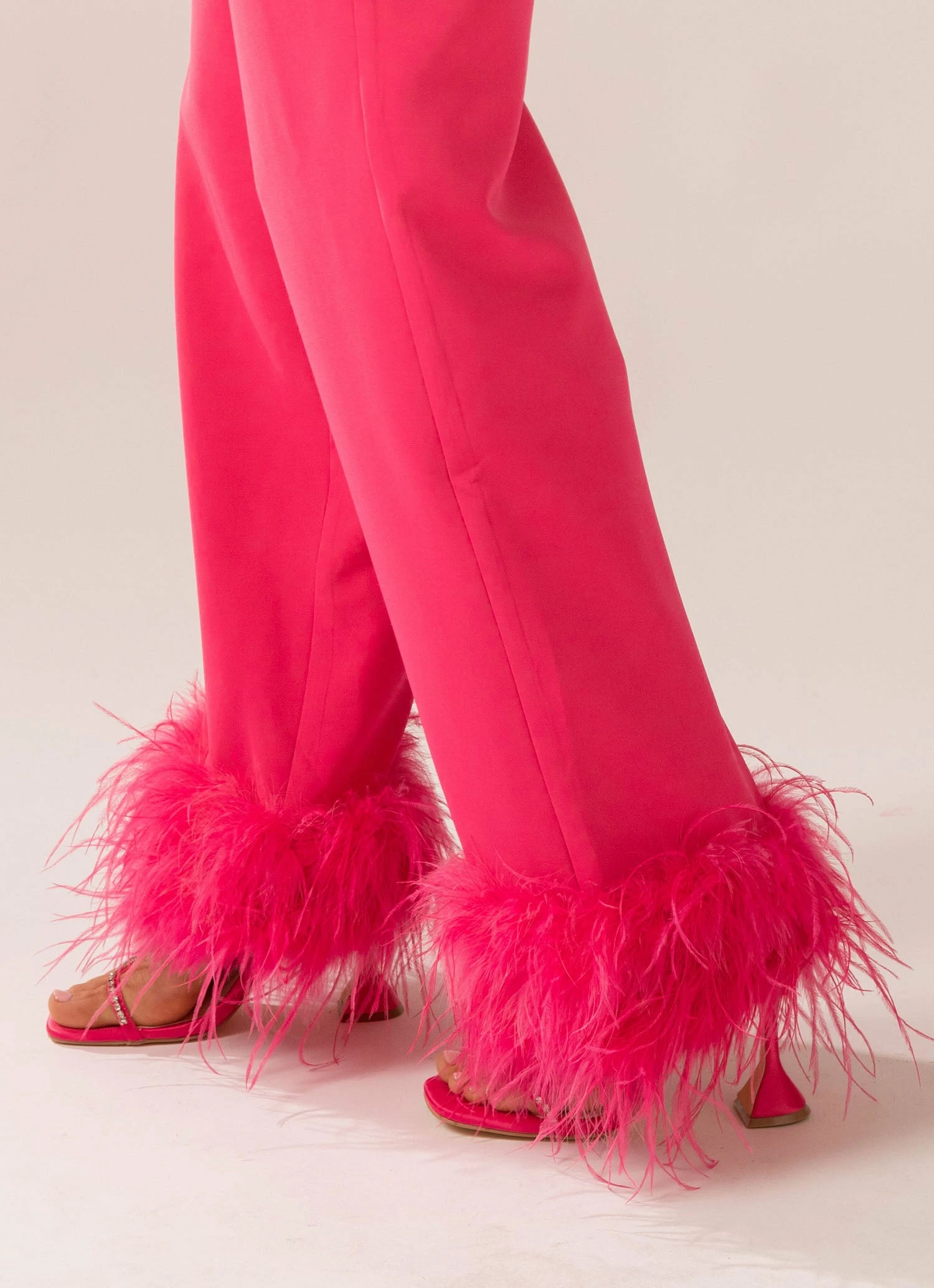 Shake it like a polaroid picture! Be the life of the party in the fun Shake It Off Feather Pants, designed to be worn higher on the hips with a wide leg fit and hemmed with feathers. Made for the Peppermayo party girl! Complete the look with the Shake It Off Feather Blazer, heeled mules and simple jewellery.