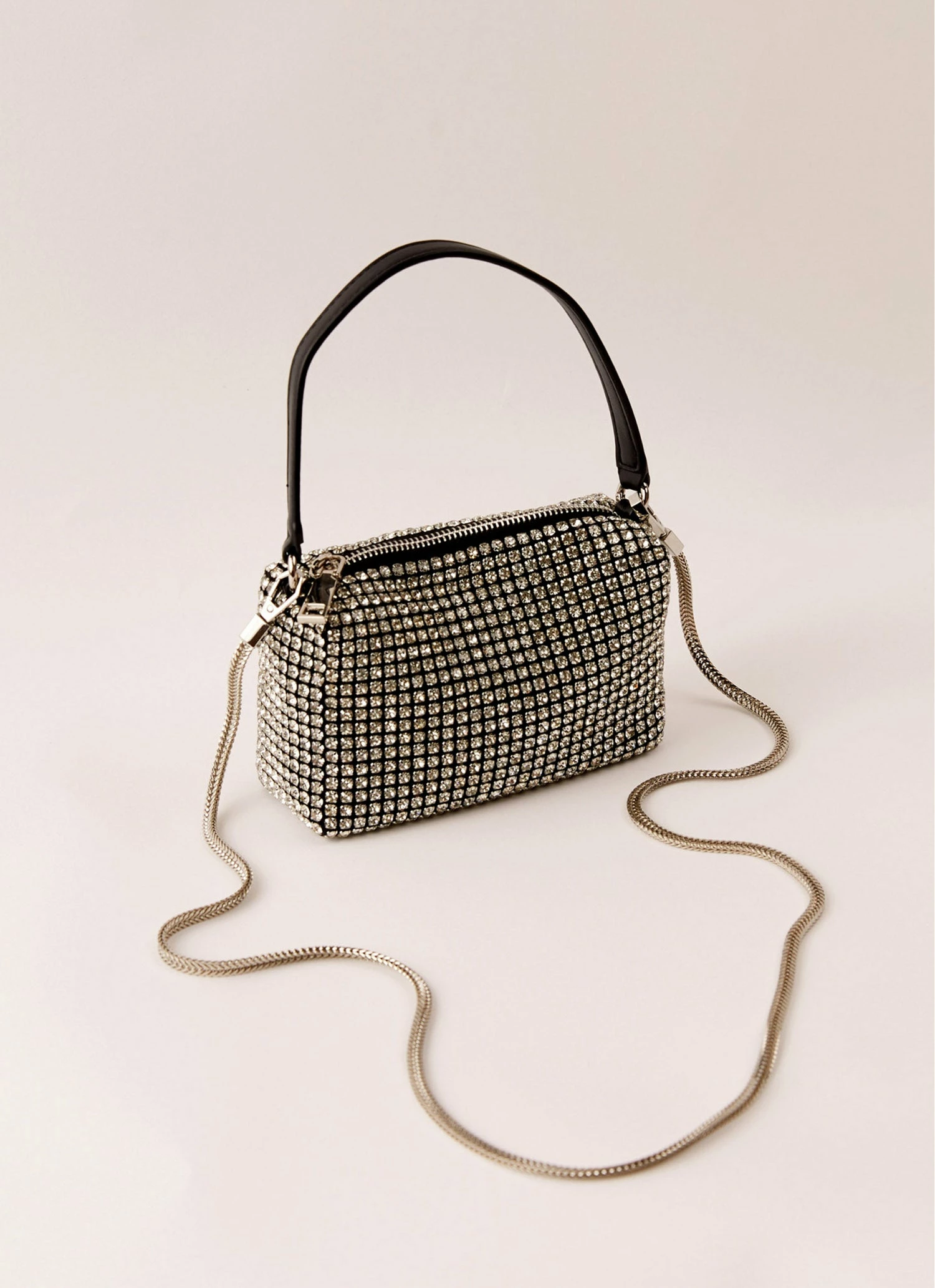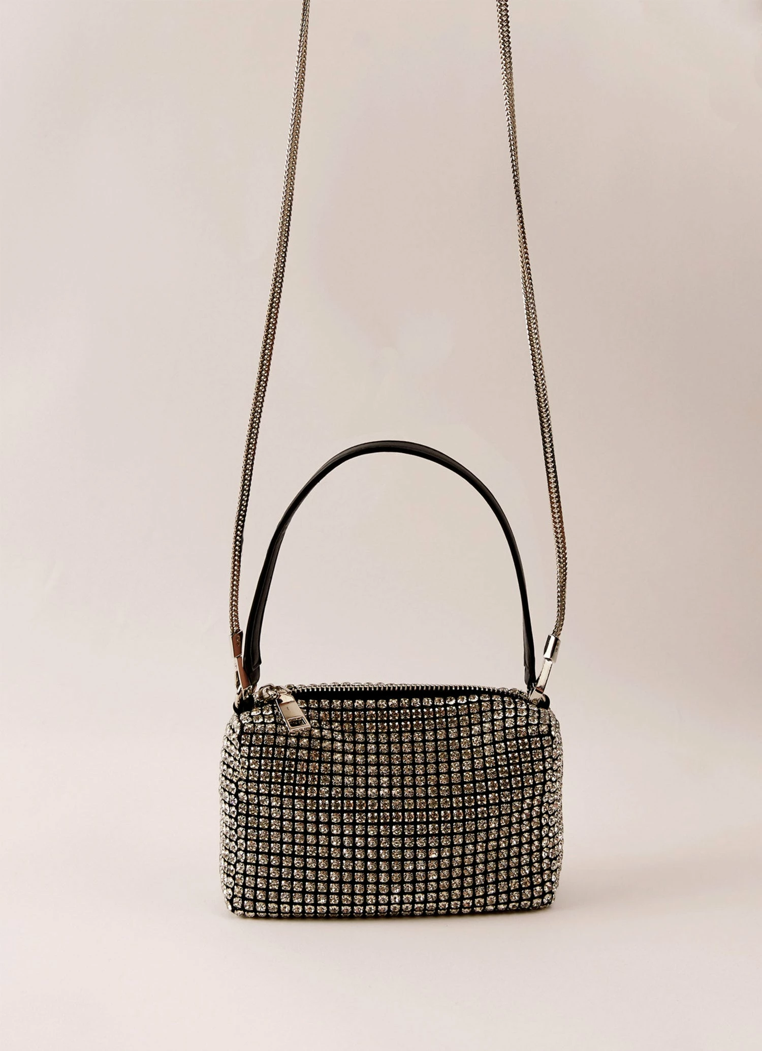 The party never stops when you’re around! The Afterparty Mini Bag is a small diamant? rectangle bag with a short black handle and detachable woven metal shoulder strap.