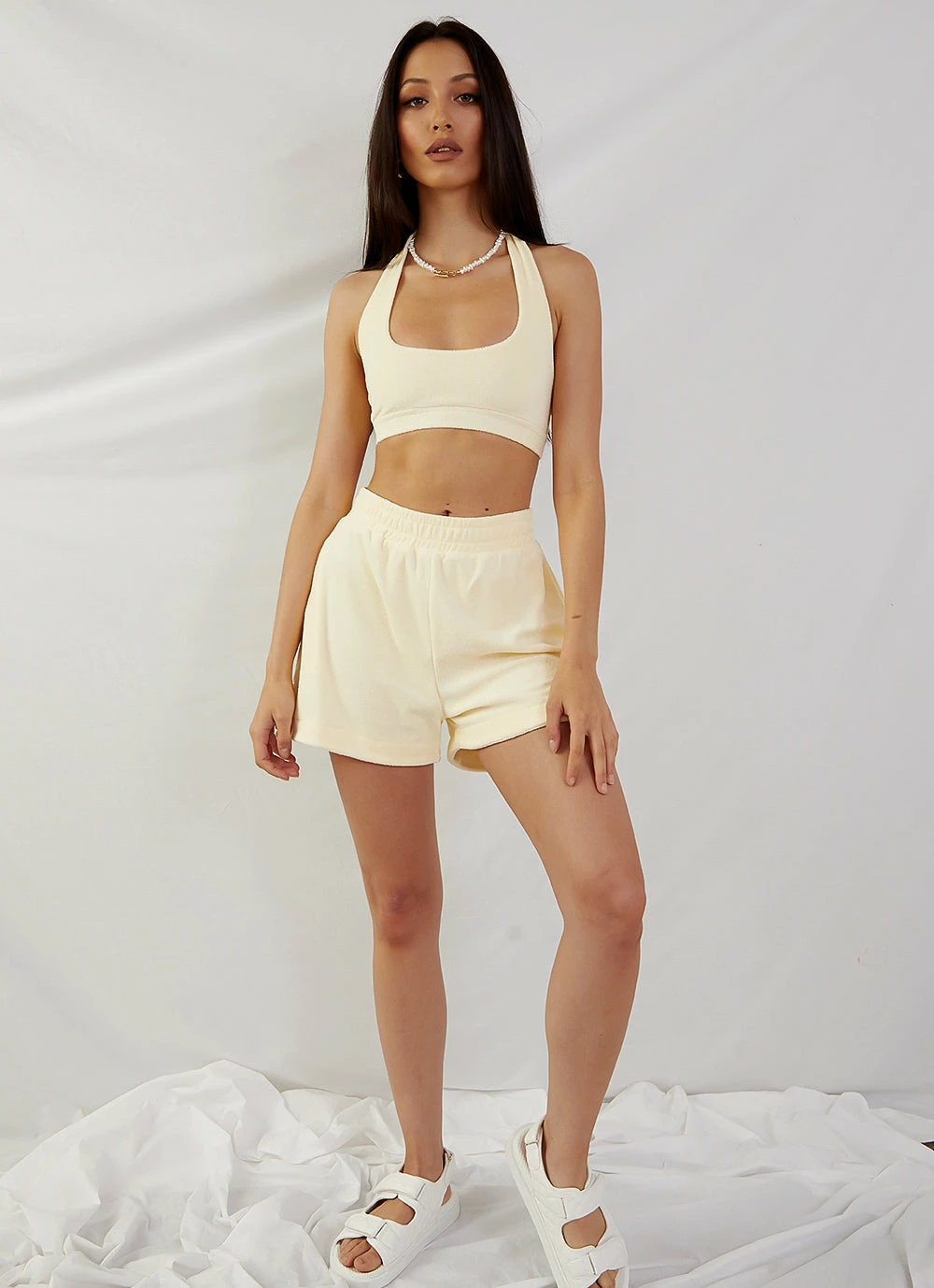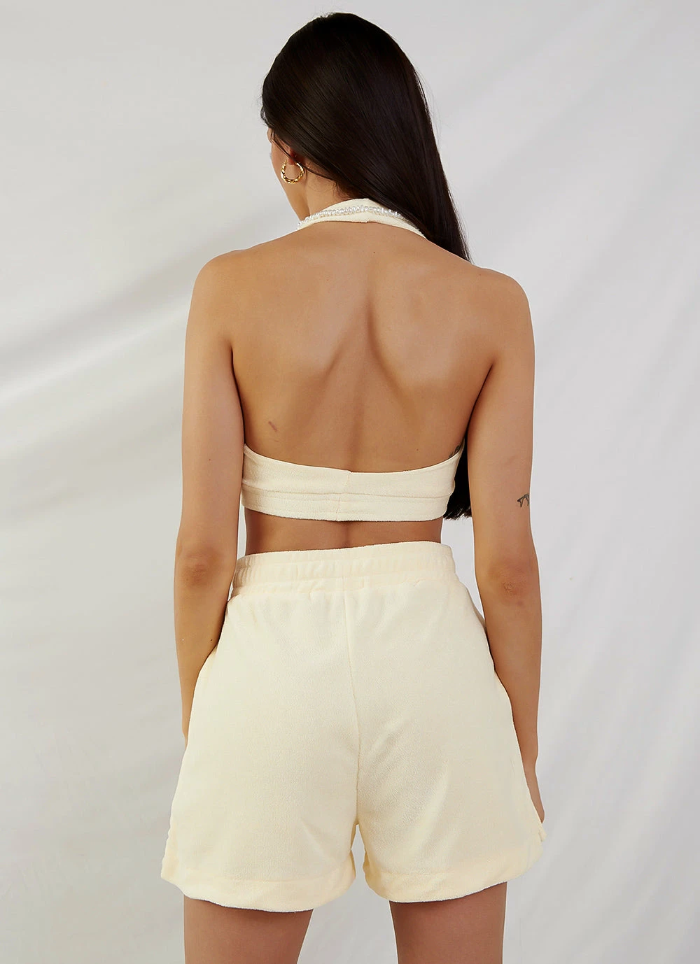 Bring the sun with you everywhere in the Voyage terry halter crop. Pair with the St Moritz Terry Shorts, linen slides and delicate gold jewellery for a super cute summer vibe.
