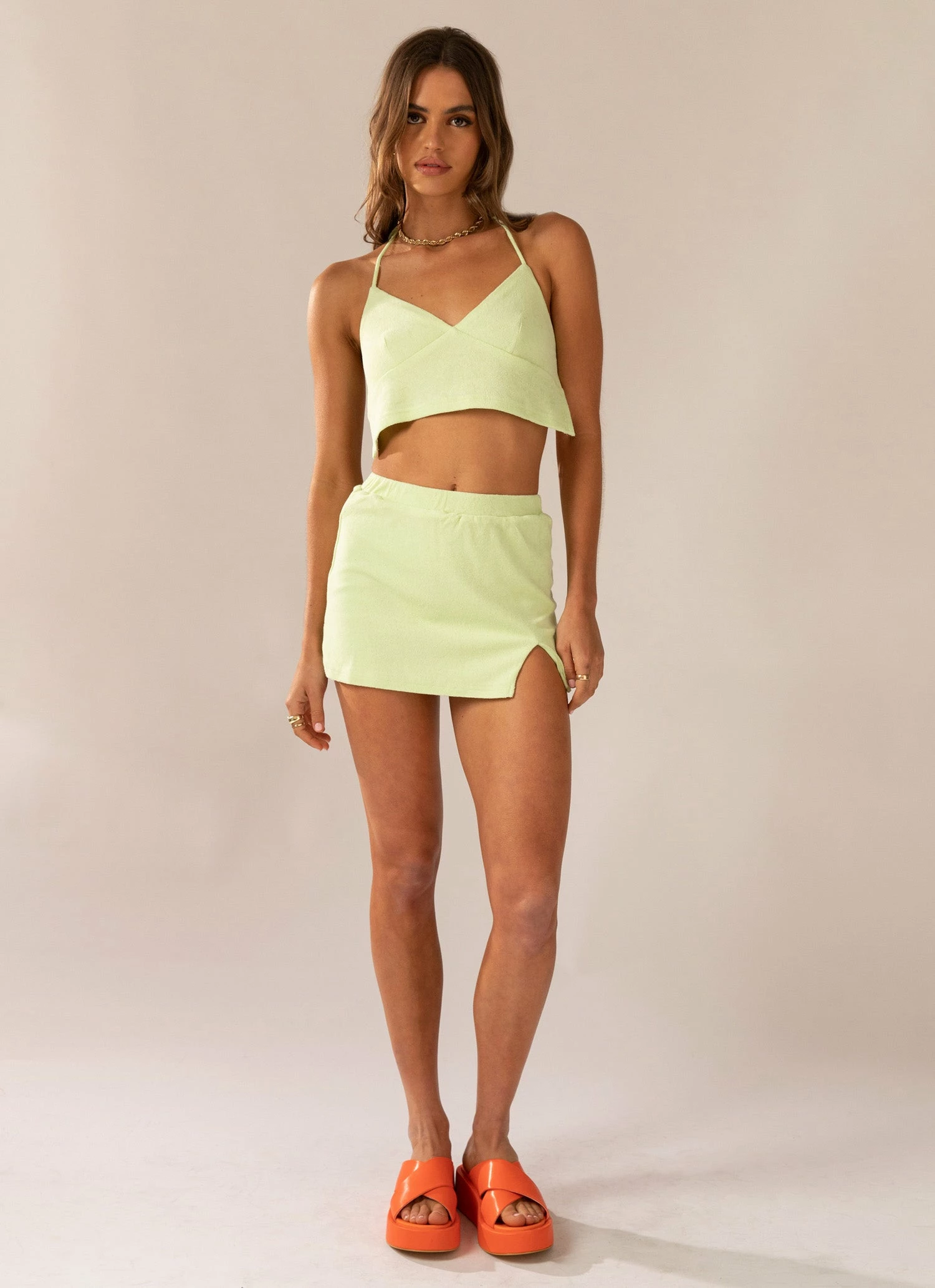 The beach club is calling and we’ve got the look for you! The Warmer Water Terry Halter is a triangle halter top design crafted in lush terry towelling. The perfect summer style with an open back an self tie halter straps and tie closure at the back.