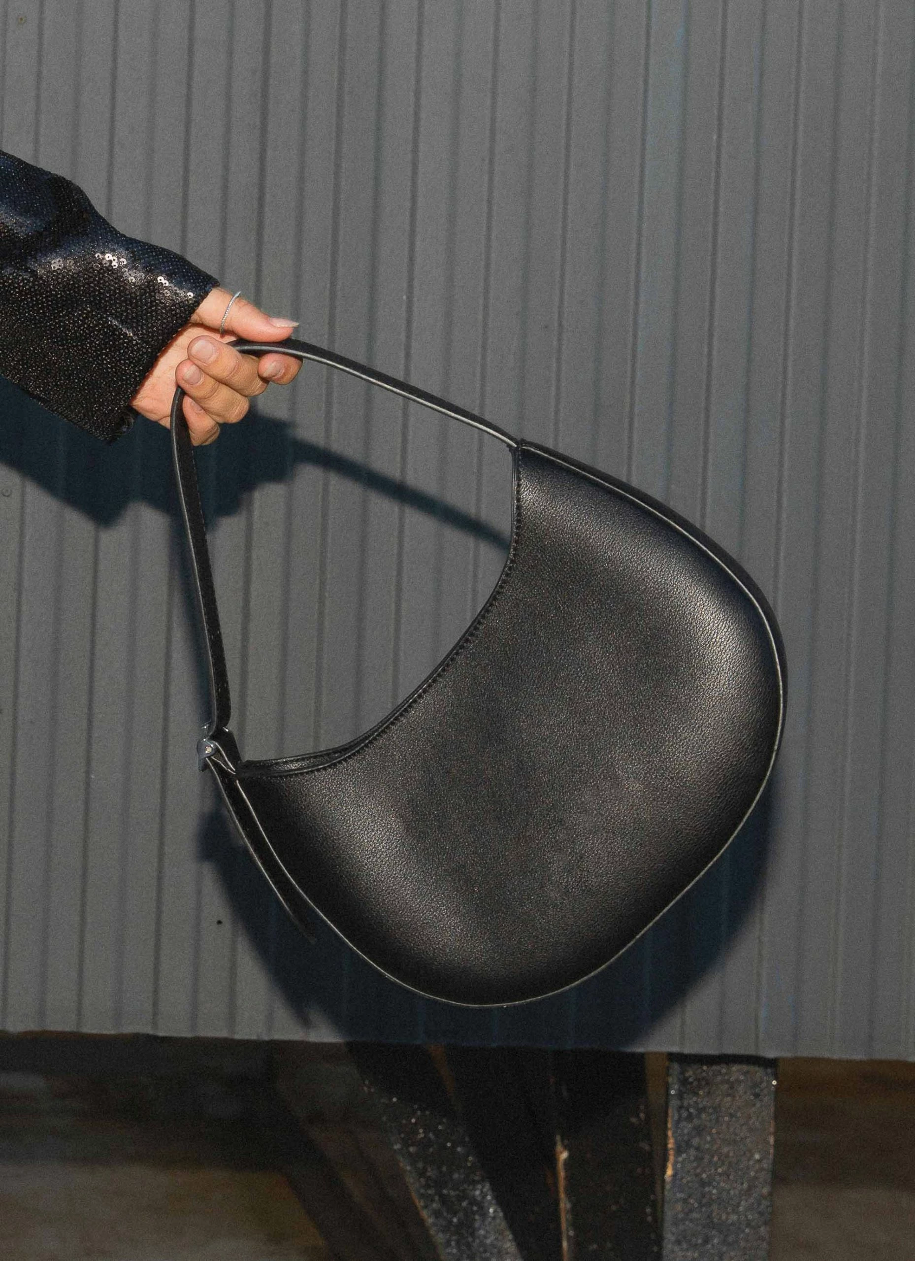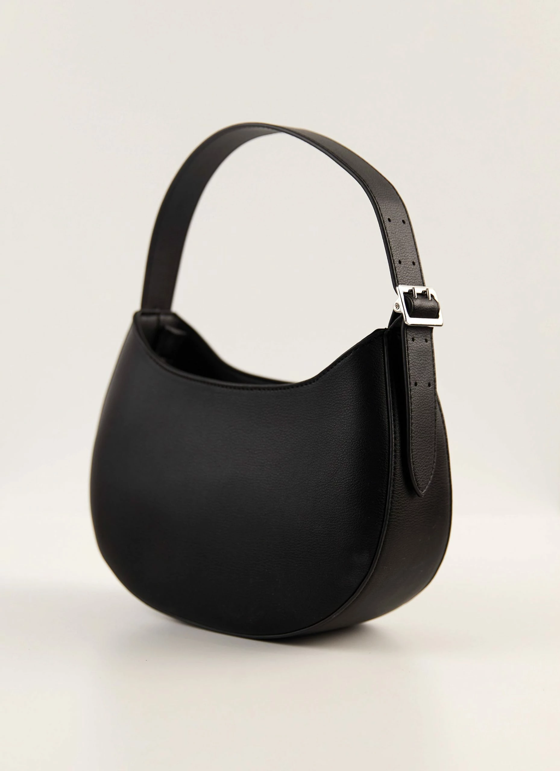 An everyday essential! Perfect for any occasion, anywhere, all the time! A shoulder bag in a classic half moon shape with thick adjustable buckle strap and contrasting silver hardware.