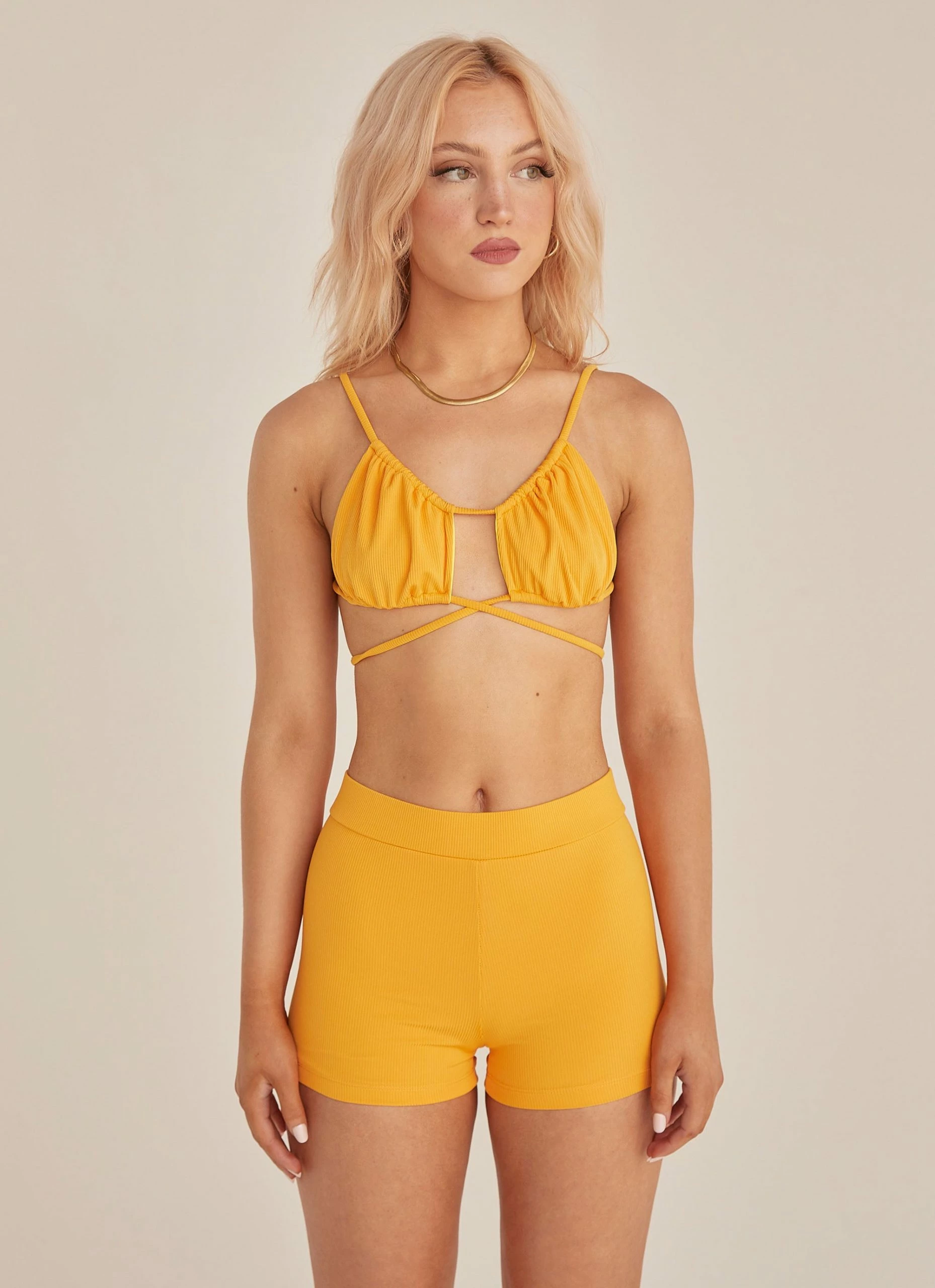 Add a sporty vibe to your ‘kini wardrobe with the Salty Day Swim Short. A high waisted, hot pant fit crafted in our eye catching summer mango ribbed fabrication.