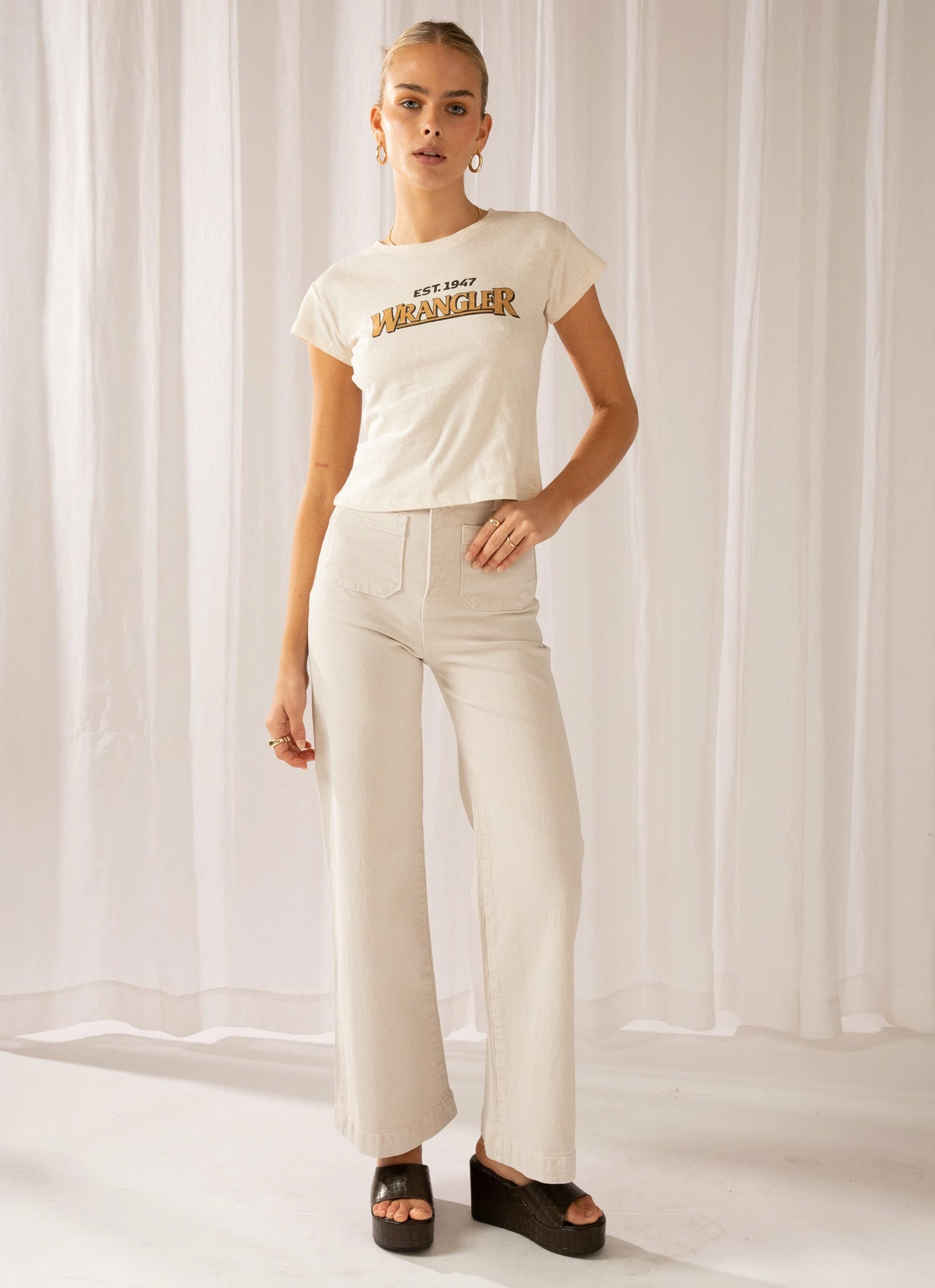 A fitted 90s inspired baby tee with a cropped waist and short capped sleeves. Featuring a worn vintage print inspired by road signs along Route 66. Perfect for winter road trips down the coast.
